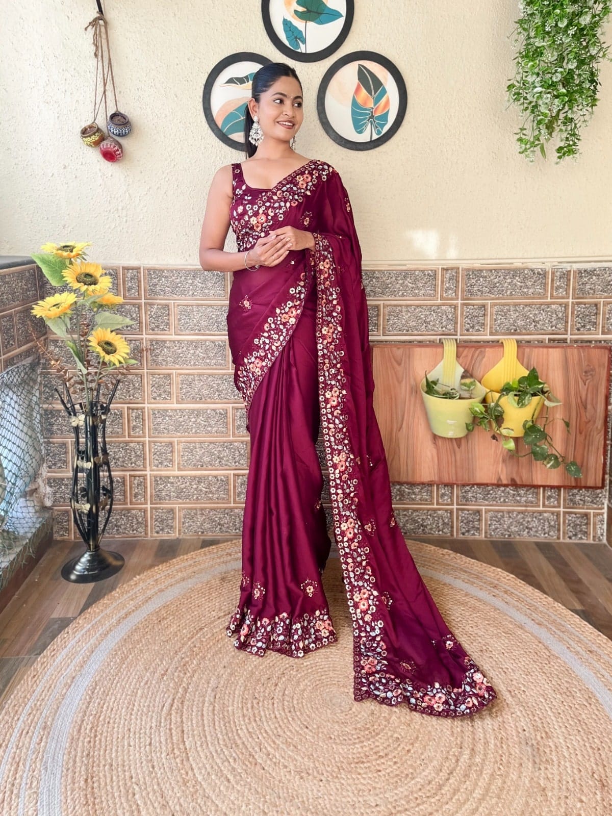 এক্সক্লুসিভ ইন্ডিয়ান সফট মেরুন কালার অরগাঞ্জা ফেব্রিকের মধ্যে গর্জিয়াস সিকুয়েন্স এমব্রয়ডারি কাজ করা পার্টি শাড়ি