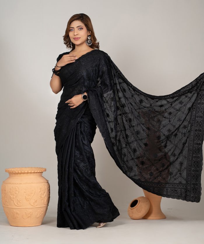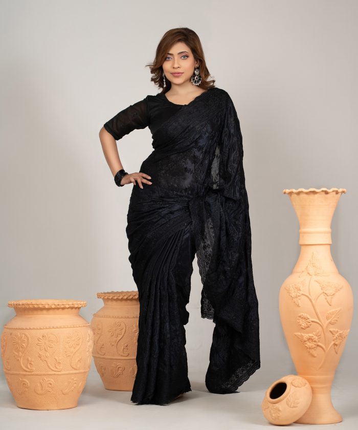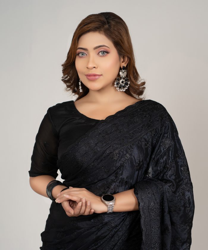 ব্ল্যাক কালার ওয়েটলেস সফট চিনিগুড়া সিল্ক ফেব্রিক এমব্রয়ডারি কাজ করা পার্টি শাড়ি।