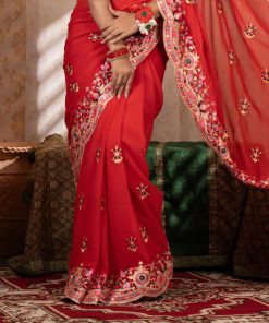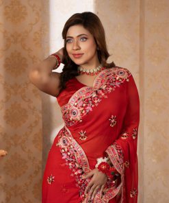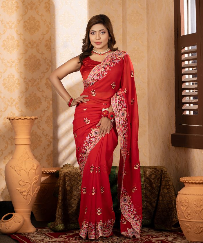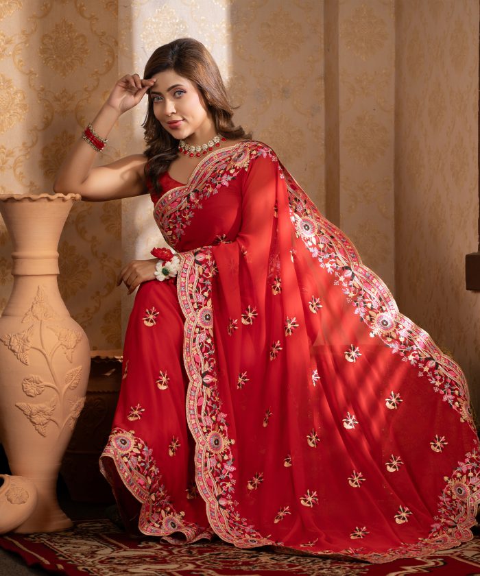 রেড কালার ওয়েটলেস সফট জর্জেট ফেব্রিক এমব্রয়ডারি কাজ করা পার্টি শাড়ি