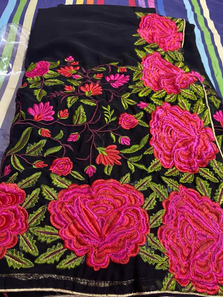 এক্সক্লুসিভ ইন্ডিয়ান ওয়েটলেস জর্জেট কালো এমব্রয়ডারি করা পার্টি শাড়ি