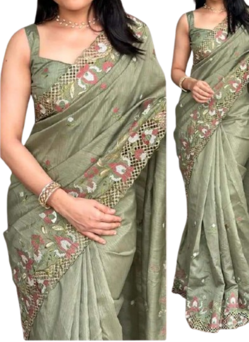 এক্সক্লুসিভ ইন্ডিয়ান বিচিত্রা সিল্ক ডাস্ট গ্রিন এমব্রয়ডারি কাজ করা পার্টি শাড়ি
